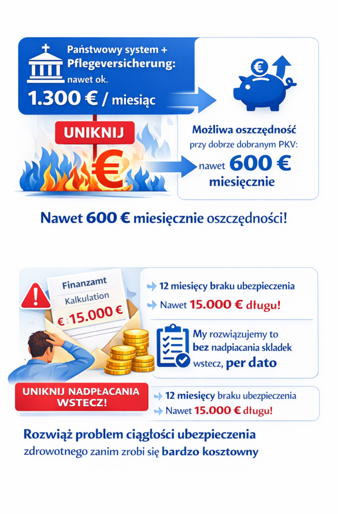 Płacisz za dużo w państwowej kasie chorych? A może prowadzisz działalność w Niemczech i nadal nie masz ubezpieczenia, bo boisz się dopłat wstecz? Sprawdzimy, jakie rozwiązanie będzie dla Ciebie najlepsze — po polsku, konkretnie i bez chaosu.